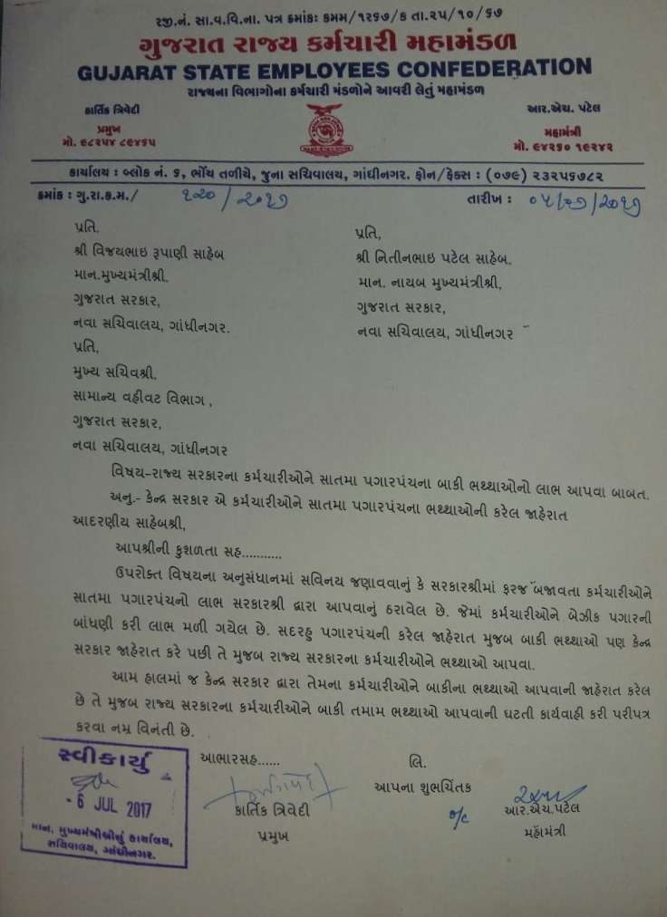 GUJARAT RAJYA NA KARMCHARIO NE SATAMA PAGAR PANCH NA BHATHTHA NA LABH BABAT GUJARAT RAJYA KARMCHARI MAHA MANDAL NO LETTER DATE- 5-7-2017.